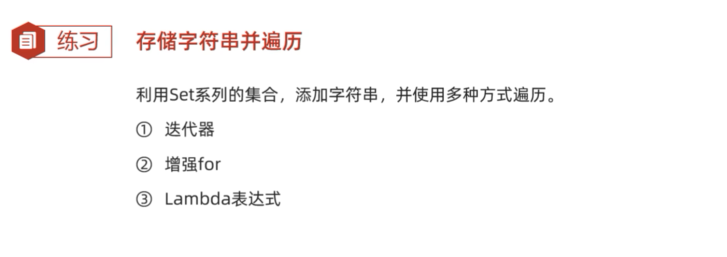import java.util.Set;public class demo1 {public static void main(String[] args) {/* 利用set系列的集合,添加字符串,并使用多种方式遍历① 迭代器② 增强for③ Lambda表达式*/// 1、创建一个set集合的对象// set是一个接口,不能创建对象,只能创建其实现类的对象Set<String> set = new HashSet<>();// 2、添加元素// 注意:// 之前我们list系列的add()方法添加的时候也是有返回值的,但是list系列运行元素重复,所以返回值总是true// 现在set系列的集合,是不允许添加重复的元素,如果添加重复的元素,那么返回值是falseboolean r1 = set.add("lkbhua");boolean r2 = set.add("lkbhua");System.out.println(r1); // trueSystem.out.println(r2); // falseset.add("hello");set.add("world");set.add("java");System.out.println(set); //[world, java, hello, lkbhua]// 说明存和取的顺序是不一样的// 1、利用迭代器的方式进行遍历/* Iterator<String> it = set.iterator();while(it.hasNext()){String s = it.next();System.out.println(s);}*/// 2、利用增强for进行遍历for(String s : set){System.out.println(s);}// 3、利用Lambda表达式进行遍历set.forEach(s -> System.out.println(s));}