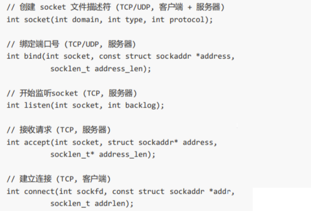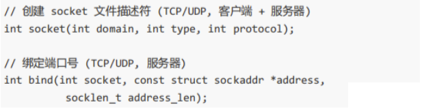 int connect(int sockfd, const struct sockaddr *addr, socklen_t addrlen);// 绑定端口号 (TCP/UDP, 服务器)