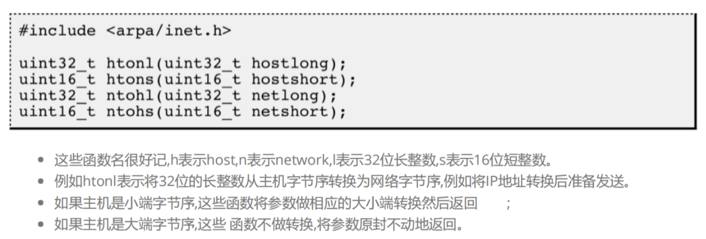 为了使网络程序具有可移植性,使同样的 C 代码在大端和小端计算机上编译后都能正常运行,可以调用以下库函数做 主机字节序 和 网络字节序 的转换。