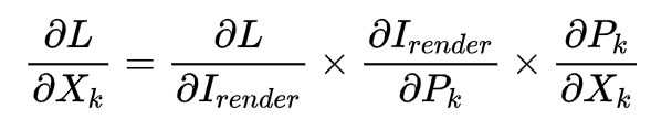 这个公式从右往左看,X_{k}就是三维空间中高斯椭球A的中心点坐标了,P_{k}是2D的高斯椭球中心点坐标,所以这个梯度对应的就是前向传播过程中3D高斯如何投影到2D高斯椭球的过程,反应的是3D中的点如何投影到2D中;右往左看第二个式子就是关于渲染的,也就是3D高斯中的α混合计算颜色的公式,某个像素的颜色是受2D高斯椭球(看他有没有覆盖到这个像素)影响的,单反应的是2D高斯椭球如何影响像素颜色;第三个公式就是损失的公式了,这个非常简单,损失就是像素值之差(L1,L2损失之类),3DGS中这个损失是用符号函数来实现的,反应的是渲染颜色和真实值偏离了多少。
