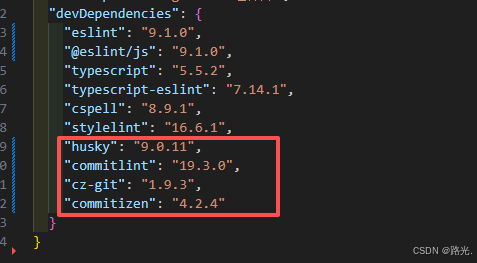 "devDependencies": {"eslint": "9.1.0","@eslint/js": "9.1.0","typescript": "5.5.2","typescript-eslint": "7.14.1","cspell": "8.9.1","stylelint": "16.6.1","husky": "9.0.11","commitlint": "19.3.0","cz-git": "1.9.3","commitizen": "4.3.0","@commitlint/config-conventional": "19.2.2"}