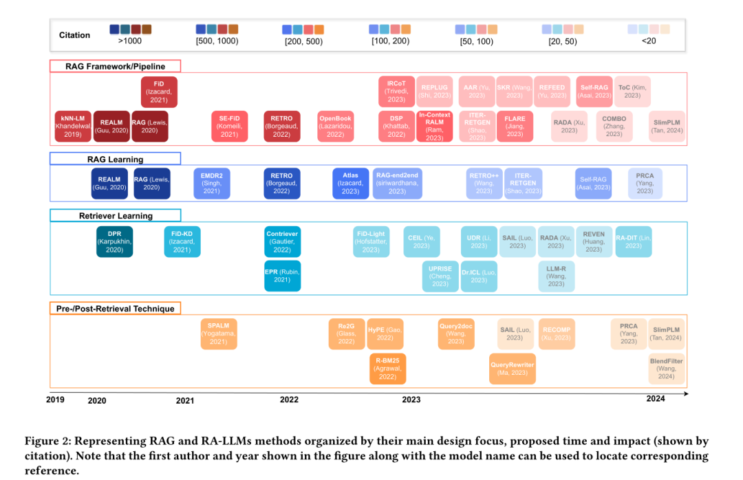 图1:按照主要设计重点、提出时间及影响力(以引用量体现)梳理的检索增强生成(RAG)和检索增强大语言模型(RA - LLMs)方法。请注意,图中所示的第一作者、年份以及模型名称可用于查找相应参考文献。[3]