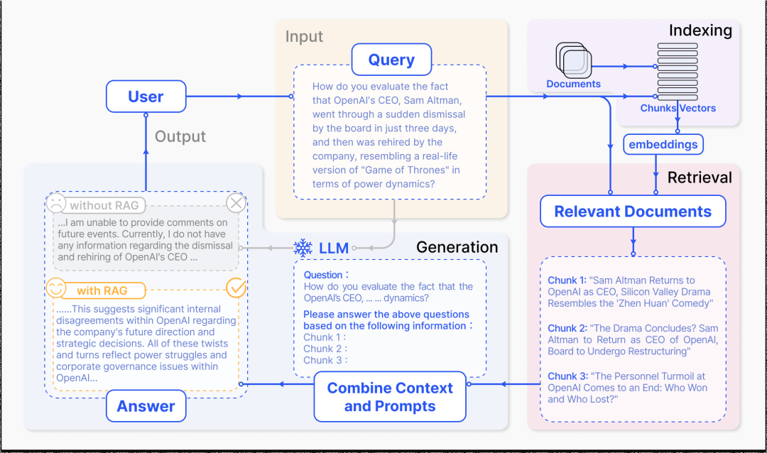 图3:应用于问答的RAG过程的代表性实例。它主要包括3个步骤。1)索引。文档被分割成块,编码成向量,存储在向量数据库中。2)检索。根据语义相似度检索与问题最相关的Top k块。3)生成。将原始问题和检索到的块一起输入LLM,生成最终答案。[2]