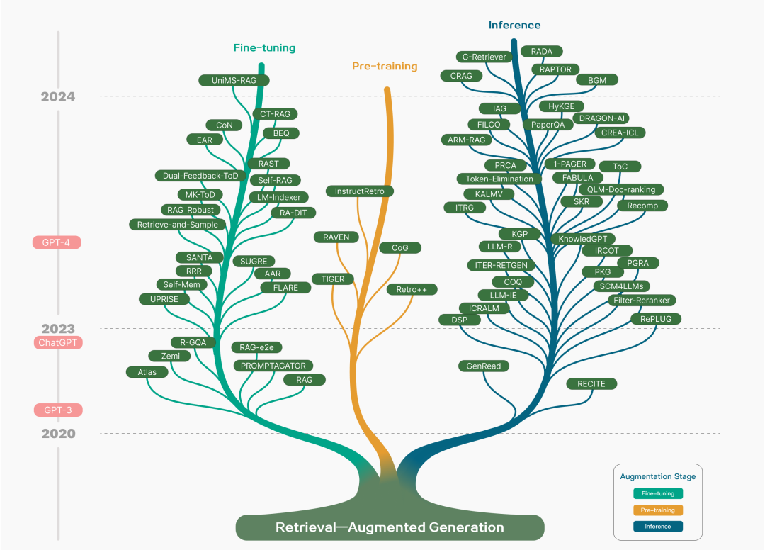 图2:RAG研究技术树。涉及RAG的阶段主要包括预训练、微调和推理。随着LLMs的出现,对RAG的研究最初侧重于利用LLMs强大的上下文学习能力,主要集中在推理阶段。随后的研究更加深入,逐渐与LLMs的微调相结合。研究人员也一直在探索通过检索增强技术在预训练阶段增强语言模型的方法。[3]