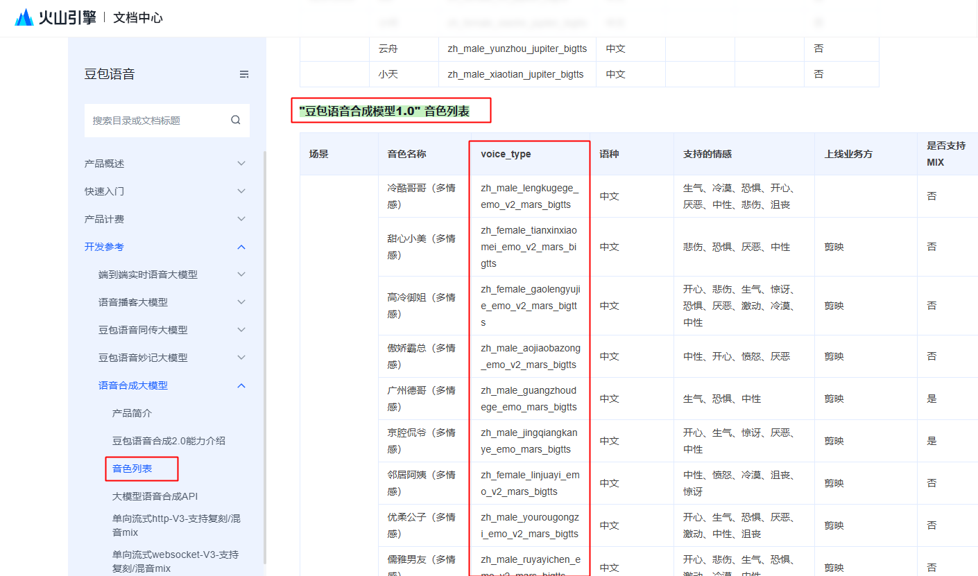 demo使用"豆包语音合成模型1.0" 音色列表,路径如下: