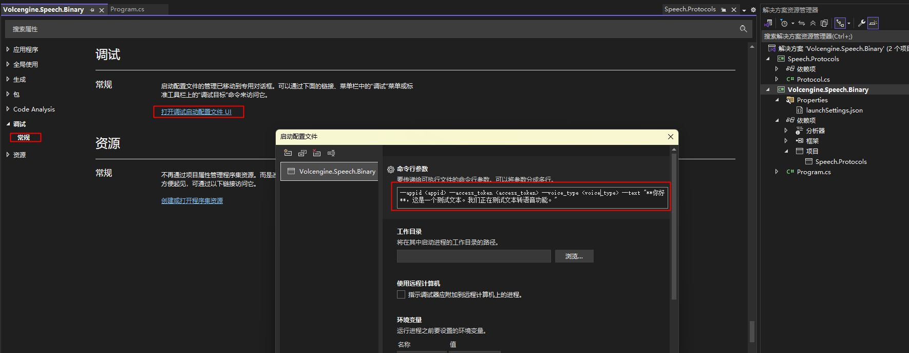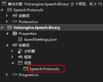 解压Demo后有两个文件,使用Vs2026打开两个工程文件,设置“Volcengine.Speech.Binary”为运行工程,引用项目“Speech.Protocols”。