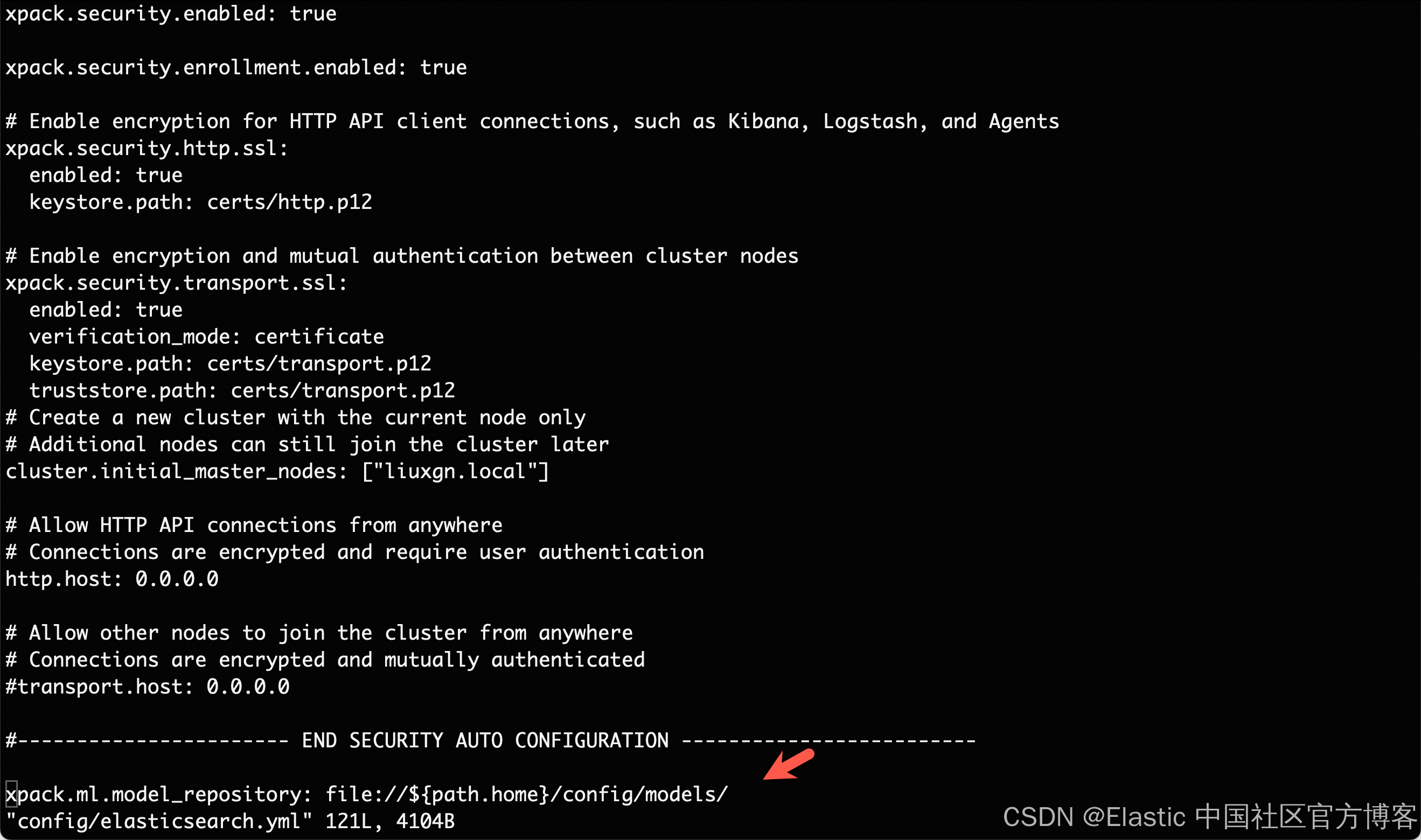 通过在 config/elasticsearch.yml 文件中添加以下行,将你的 Elasticsearch 部署指向模型目录: