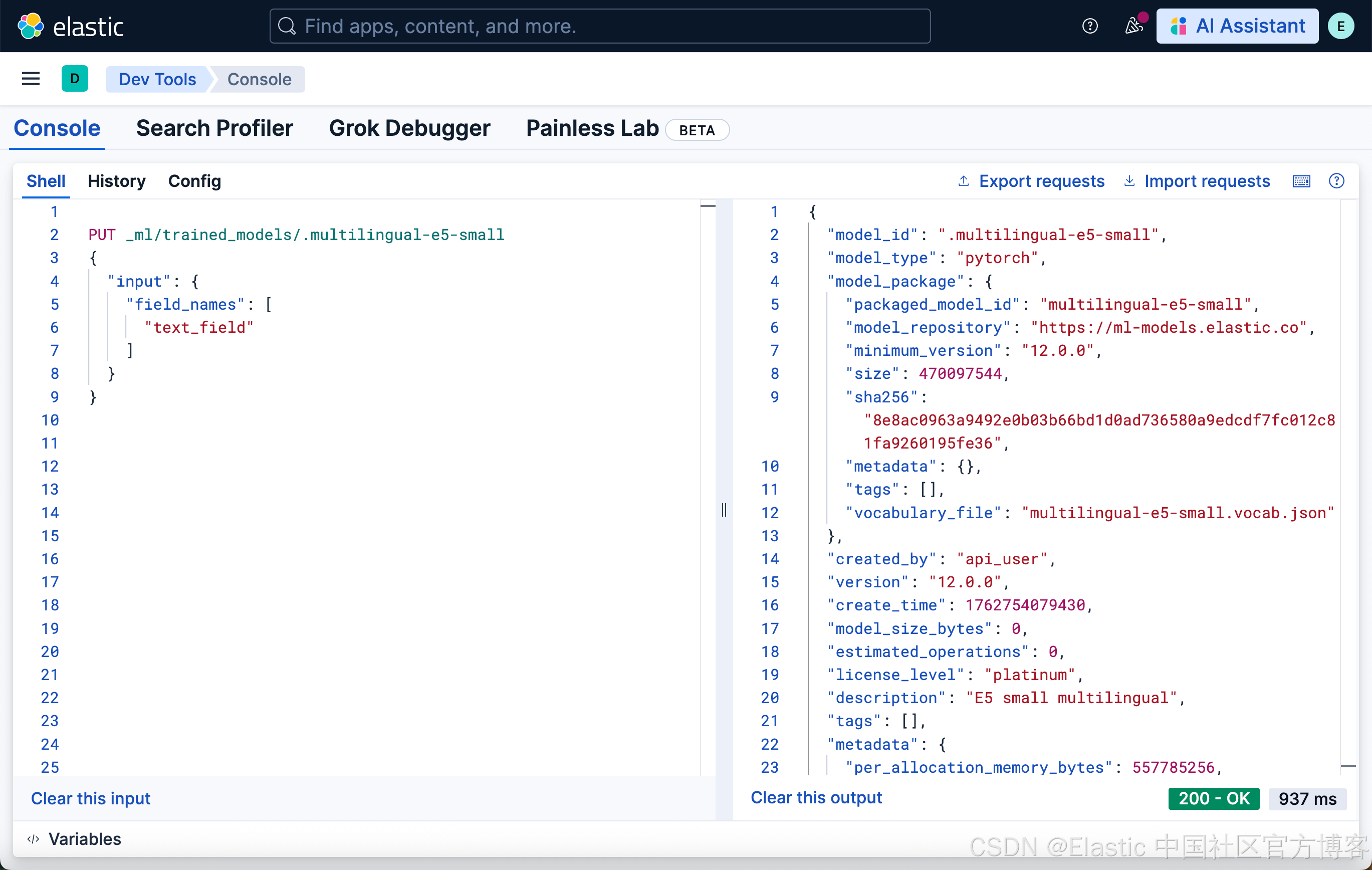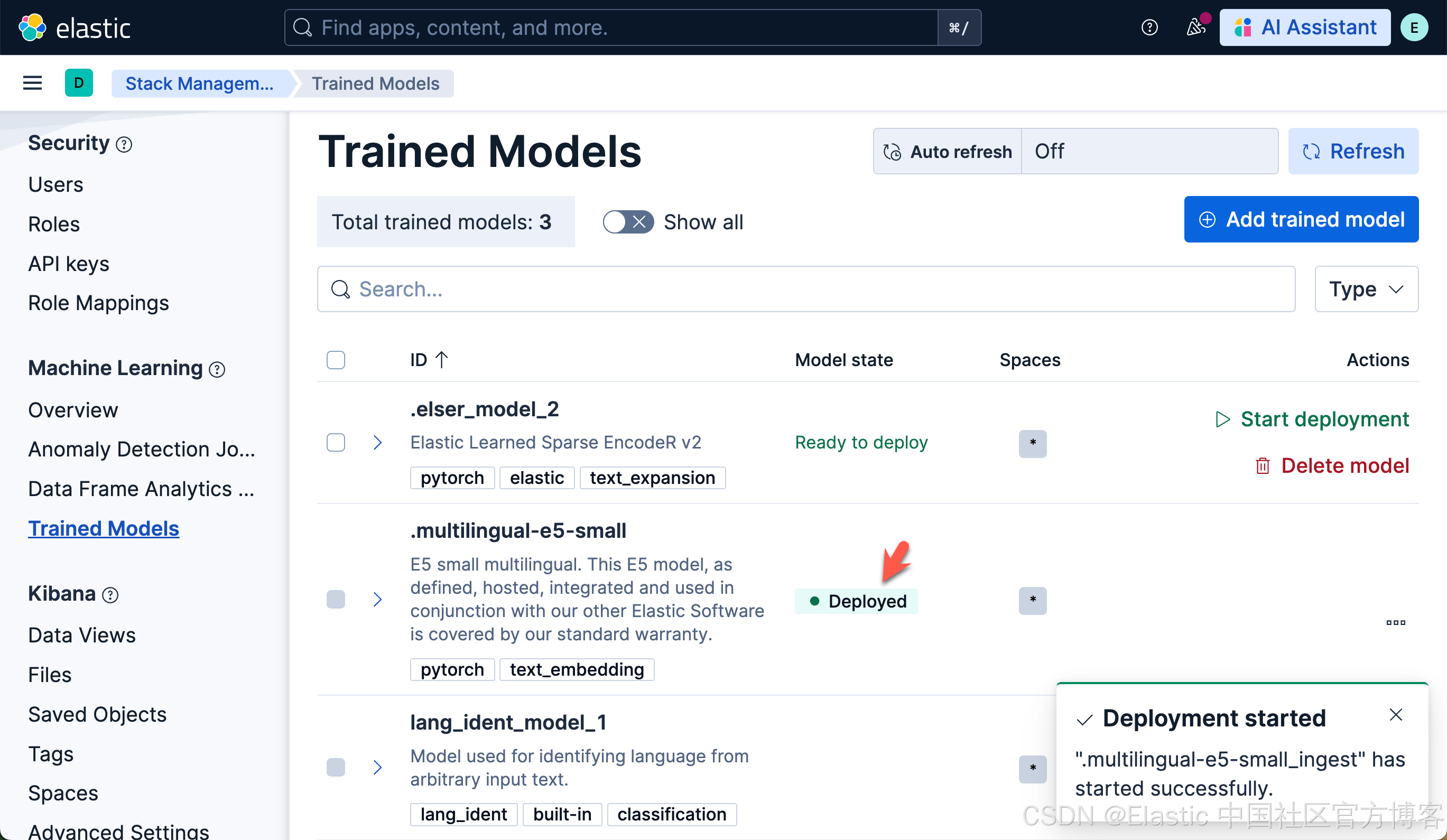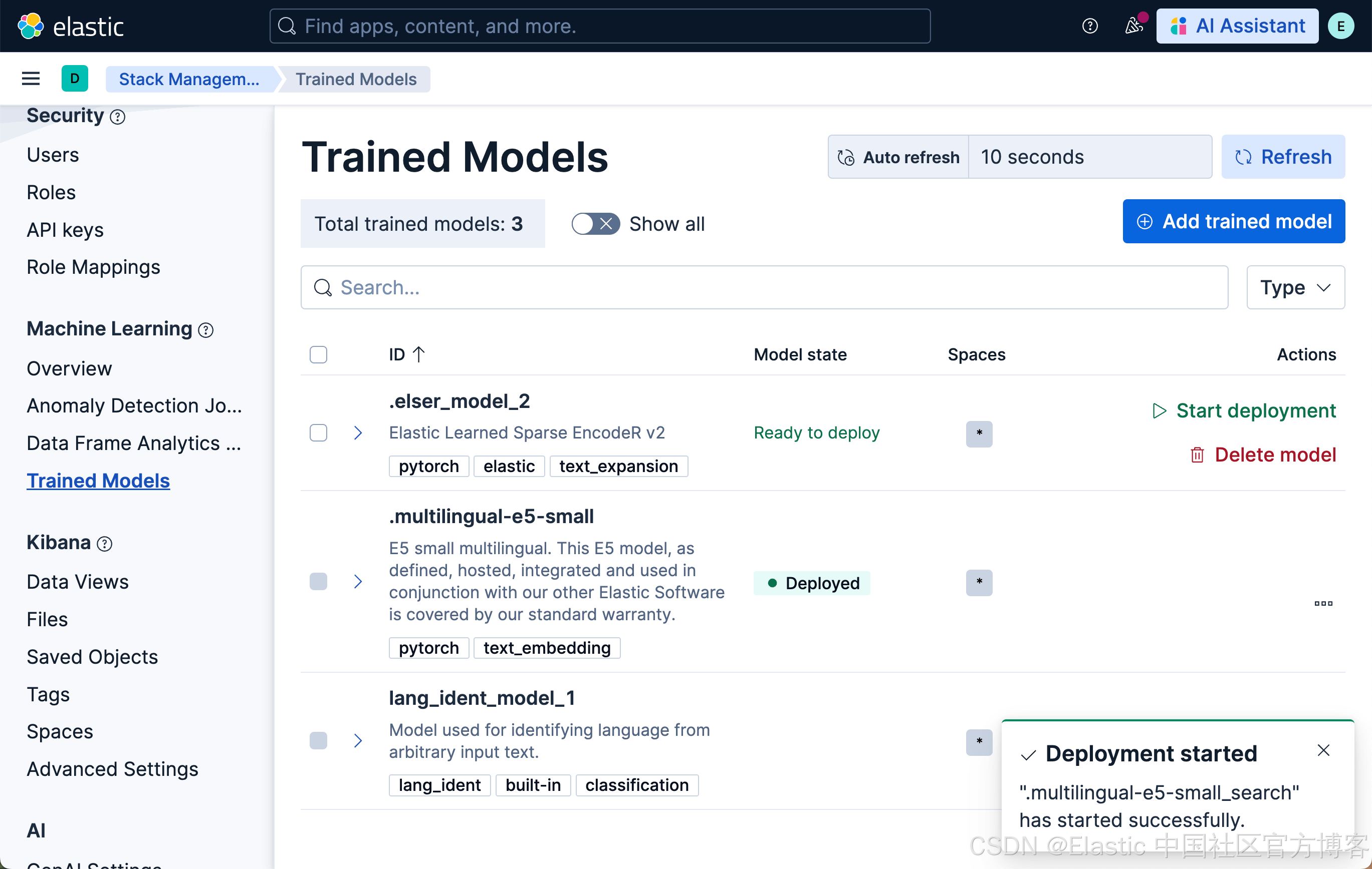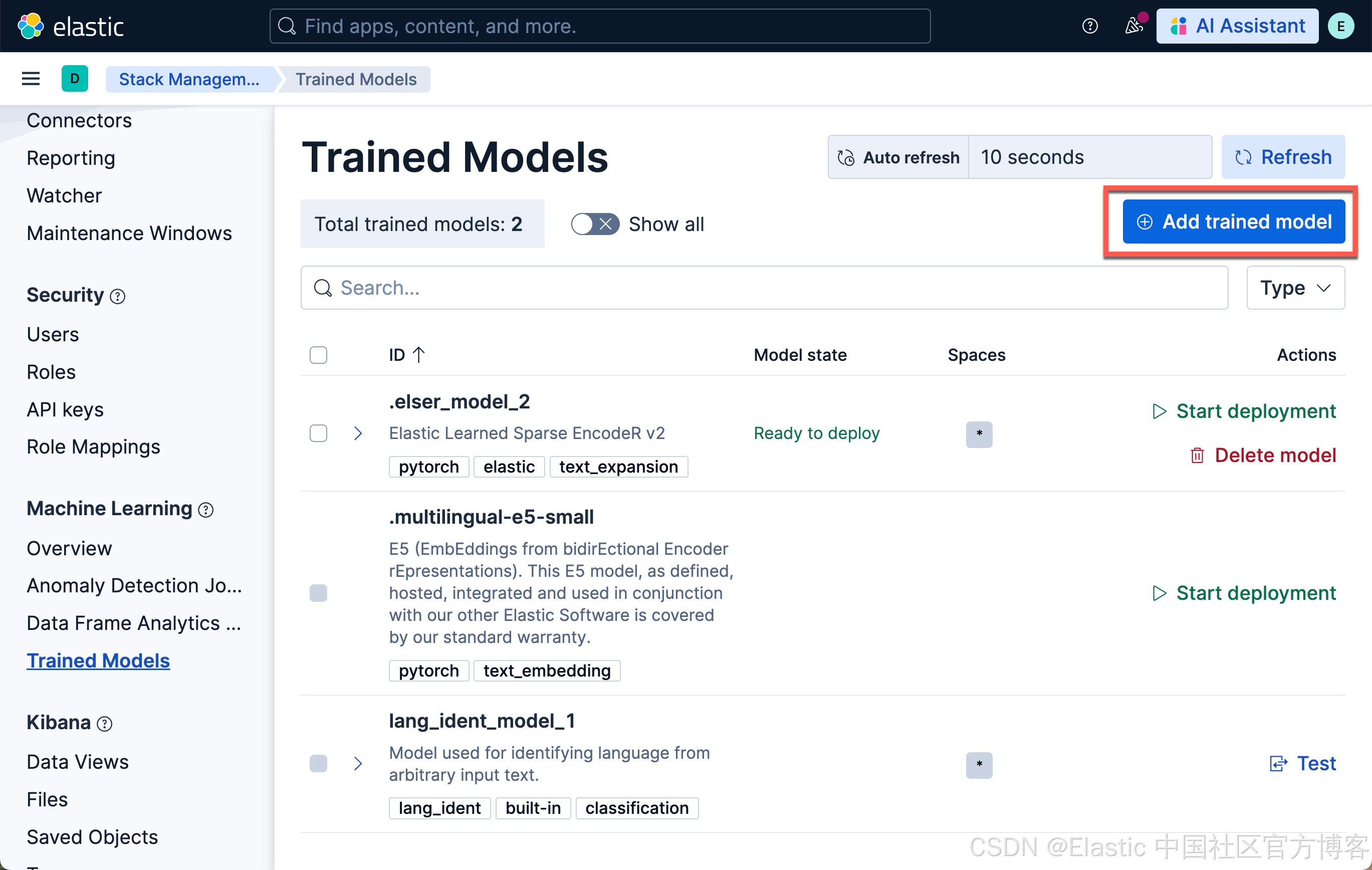 你也可以从 Trained models 页面、Search > Indices,或通过在 Dev Console 中使用 trained models API 下载并部署 E5 模型。