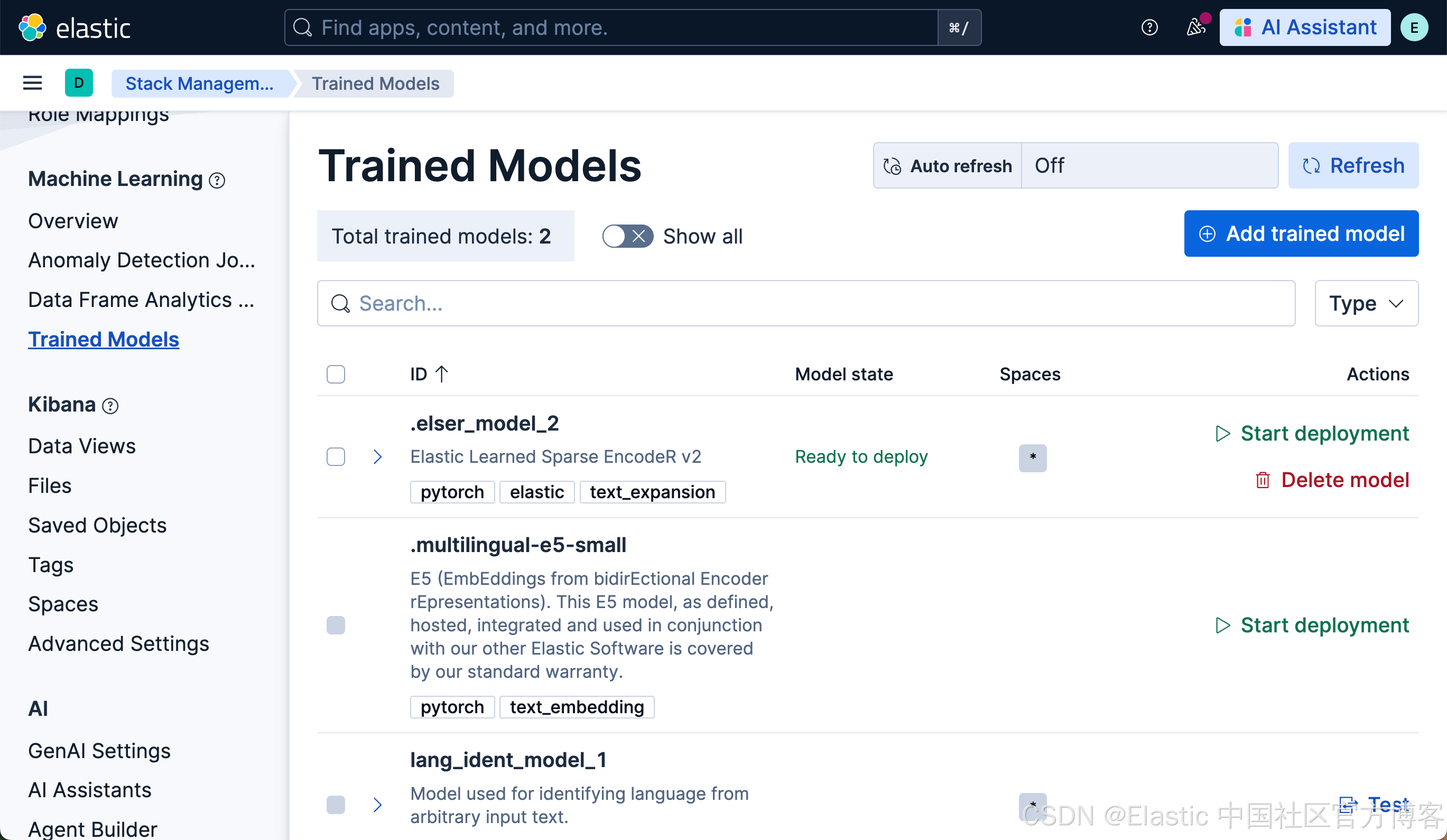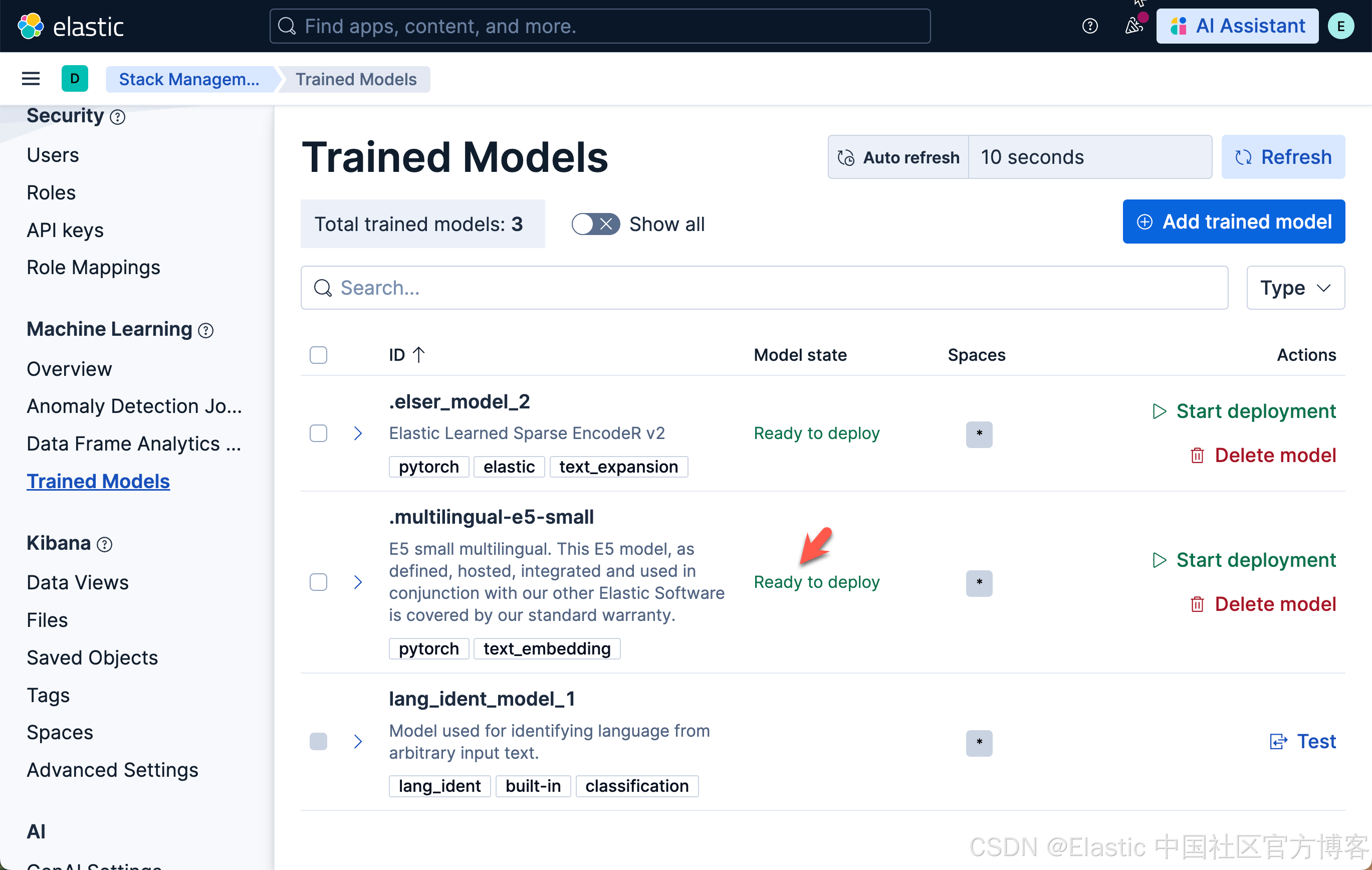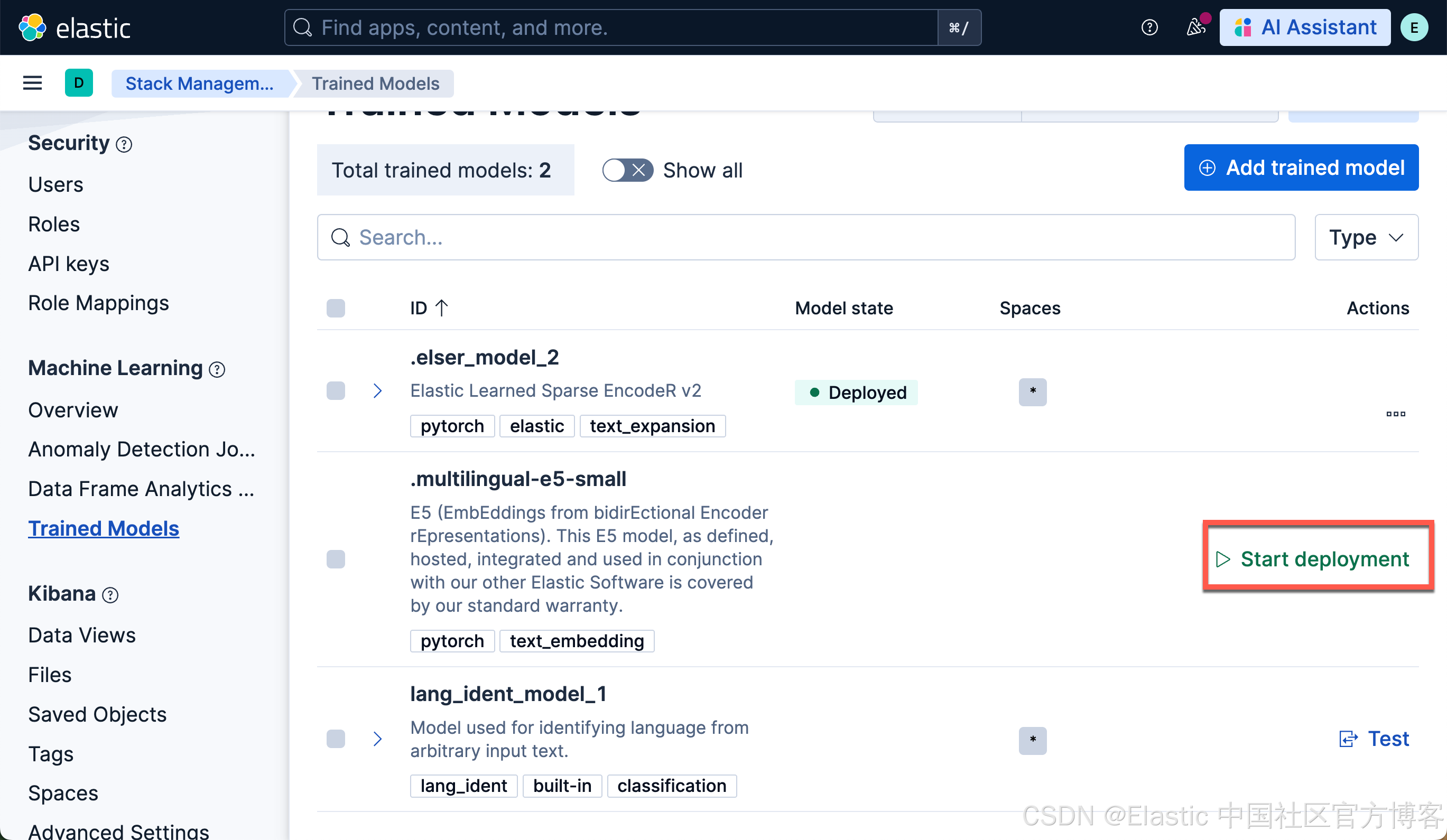 从主菜单进入 Trained Models 页面,或使用 Kibana 的全局搜索字段。你可以在训练模型列表中找到 E5。