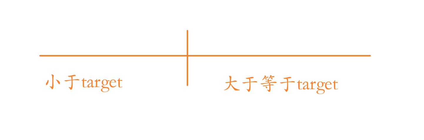 通过题目的要求我们可以看出数组是有二段性的,所以我们把数组里面的数字分成两类:小于 target 和 大于等于 target;我们从这个数字分类可以看出可以使用查找左端点的二分查找来解决这道题目: