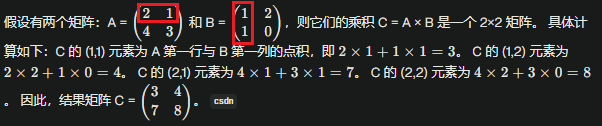 维度: n×p 矩阵乘以 p×m 矩阵得到 n×m 矩阵