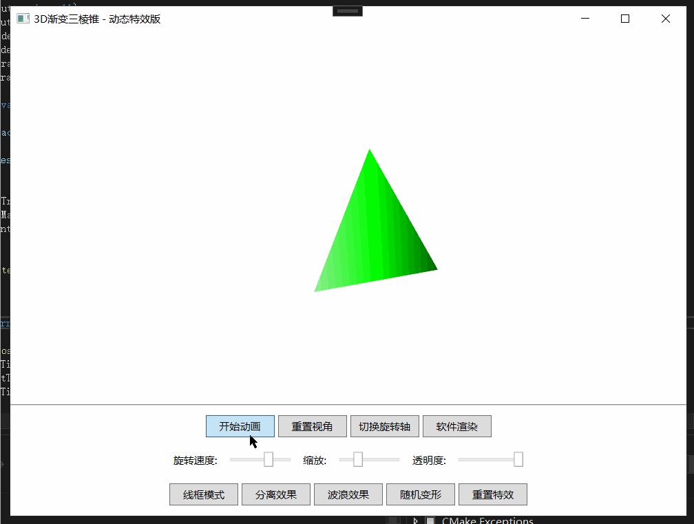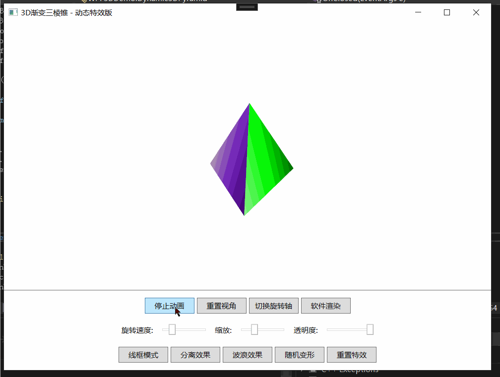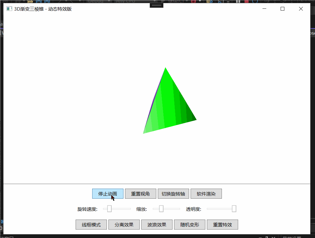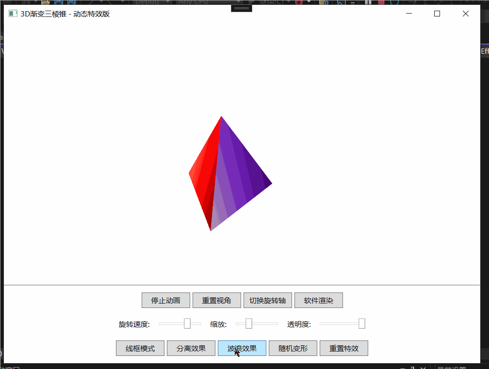 这是一个基于WPF 3D图形技术开发的动态三棱锥演示程序,不仅实现了基础的3D模型展示,还集成了多种高级特效和交互功能。