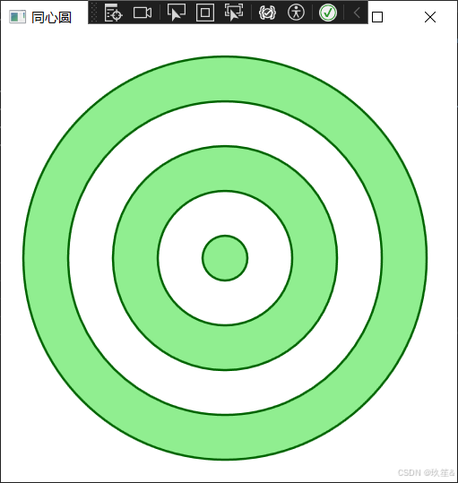 <Window x:Class="WpfGeometryDemo.ConcentricCirclesWindow"xmlns="http://schemas.microsoft.com/winfx/2006/xaml/presentation"xmlns:x="http://schemas.microsoft.com/winfx/2006/xaml"Title="同心圆" Height="400" Width="400"><Grid><Path Fill="LightGreen" Stroke="DarkGreen" StrokeThickness="2"><Path.Data><GeometryGroup FillRule="EvenOdd"><EllipseGeometry Center="200,200" RadiusX="180" RadiusY="180"/><EllipseGeometry Center="200,200" RadiusX="140" RadiusY="140"/><EllipseGeometry Center="200,200" RadiusX="100" RadiusY="100"/><EllipseGeometry Center="200,200" RadiusX="60" RadiusY="60"/><EllipseGeometry Center="200,200" RadiusX="20" RadiusY="20"/></GeometryGroup></Path.Data></Path></Grid>