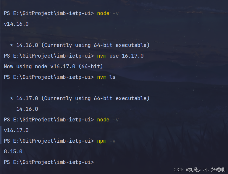 nvm use 18.12.0 # 切换到 18.12.0 nvm use 18.12.0 32 # 切换到 32 位版本(默认 64 位)查看已安装版本