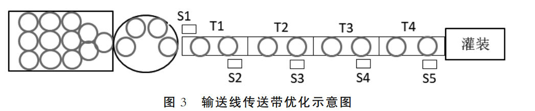 优化措施:在每段传送带末端安装光电传感器,如图3所示,确定每段的有/无料状态;传送带自罐入口处开始至灌装机入口处编号为 T1-T4,配装的传感器编号为S2-S5。启动时顺次启动,即按下启动按钮 T1段传送带启动,待S2检测到罐后再启动 T2段传送带,依此类推。停止时,按下停止按钮后,T1段停止,其它段传送带在本段末端传感器30秒内检测不到罐后停止。即 T2段传送带在S2传感器30秒检测不到罐后停止,依此类推。