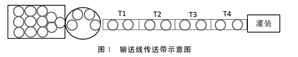 本设计有分段传送带4段,输送电机4台。结构示意图如图1所示,T1、T2、T3、T4分别代表4段传送带。现有罐装输送线的入口盘处、灌装机前端的输送带转弯处有时会出现卡罐现象,并缺少报警装置,如不及时发现会造成输送带空位,造成“漏罐”现象。原设计中按下启动按钮,所有传送带同时启动,按下停止按钮后所有传送带同时停止;另外当出现罐挤压时,传送带停止导致停机率较高,影响生产效率。