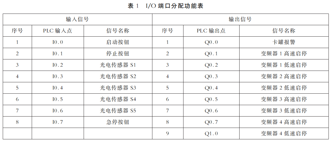 根据改进后的传送带系统的要求,需要8个输入信号,分别为启动按钮、停止按钮、急停按钮及5个光电传感器,5个光电传感器信号分别对应入口盘处是否发生卡罐的信号、在 T1—T4段传送带检测罐的信号。系统需要9个输出信号,分别为卡罐报警信号、控制 T1—T4段传送带高速、低速运行的变频器信号。