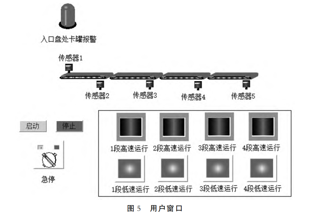人机交互界面将信息化与工业化进行深度融合,是智能制造的重要组成部分。MCGS嵌入式组态软件功能强大,可视化操作界面简单灵活、多媒体画面生动丰富、并且实时性强、有多种报警方式, 可以方便地开发各种设备。本输送线传送带的运行状态监控画面采用 MCGS嵌入式组态软件进行组态设计,为保证工程的安全性,为不同的群组设置不同的权限。启动软件,即可进入用户窗口,通过触摸屏可实现启动、停止、急停等操作,当入口盘处出现卡罐现象时,将在触摸屏上进行报警,提醒工作人员快速进行处理。4段传送带在运行过程中,监控画面可实时显示每段传送带的高低速运行状态。用户窗口如图5所示。