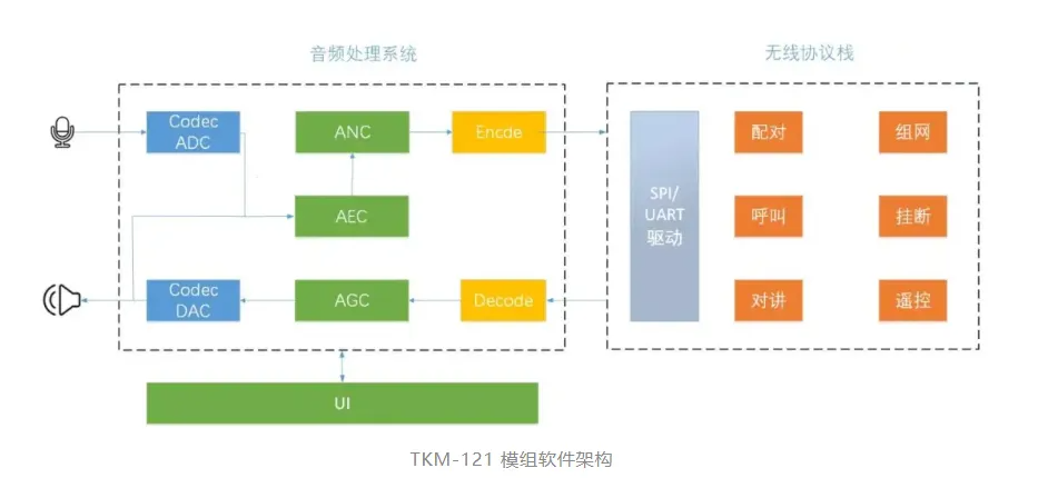 TKM-121 系列模组采用了灵活可编程的软编解码方式,可处理不同码率格式的语音数据。支持从低比特率窄带语音扩展至高清音质的立体声音乐;具有低延迟的特性,适合用于实时语音通话;还可升级支持更多特性。