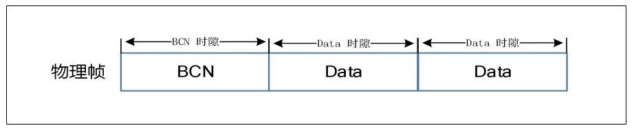 最小单位,表示一个时间分片,分片长度可以调整。下图是一种典型的物理帧结构,由 1 个 BCN 时隙和 2 个 Data 时隙组成,Data 时隙可以用于数据接 收或发送。