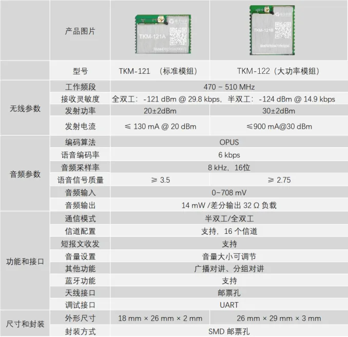 | 语音系列模组包含标准功率模组 TKM-121和大功率模组 TKM-122 两款产品,分别支持 20 dBm 和 30 dBm 发射功率。TKM-121 系列模组采用了低延迟、高质量和低码率的语音编解码算法以及去噪、回音抵消算法,实现长距离语音传输;基于精确的时隙调度机制,支持半双工、全双工通信模式,可实现单播、组播和广播对讲功能;支持蓝牙、接口齐全、集成度高,客户只需外接电源、麦克风、语音放大器、扬声器和天线,便于开发和应用。 |