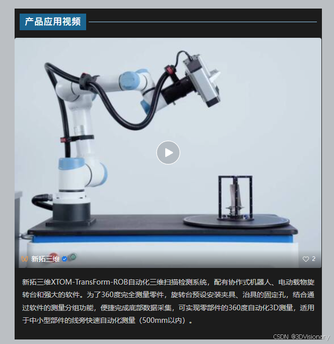 在标准化的生产线,人工检测的效率和重复精度难以保证,这时需要借助自动化3D扫描检测手段。XTOM-TransForm-ROB自动化三维检测系统可满足上述需求,它集数据采集及检测分析于一体,在保证测量精度的同时,能大幅提升扫描检测效率。