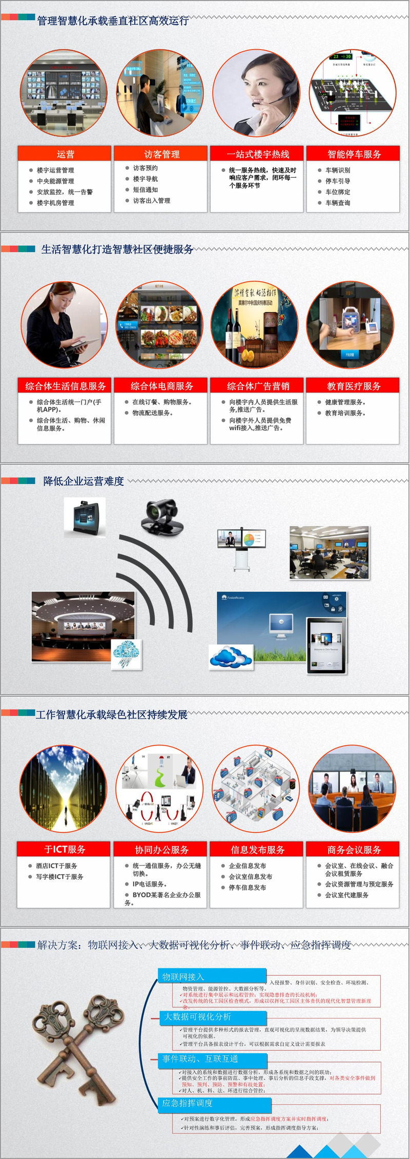 在具体建设内容上,平台构建电子地图管理、视频监控、报警联动、巡检系统、供配电管理、照明管理、喷淋管理、供水管理、环境检测等系统,形成安全防范管理平台,通过静态三层防线、动态应急系统和系统联动,保障园区安全。各云平台功能明确,CT 智慧营销云为企业提供产品展示与招商推广服务,园企智慧服务云为入驻企业提供标准化云服务,FM 智慧运维云基于 BIM、GIS 等技术实现园区设施设备智能运维与高效管理。