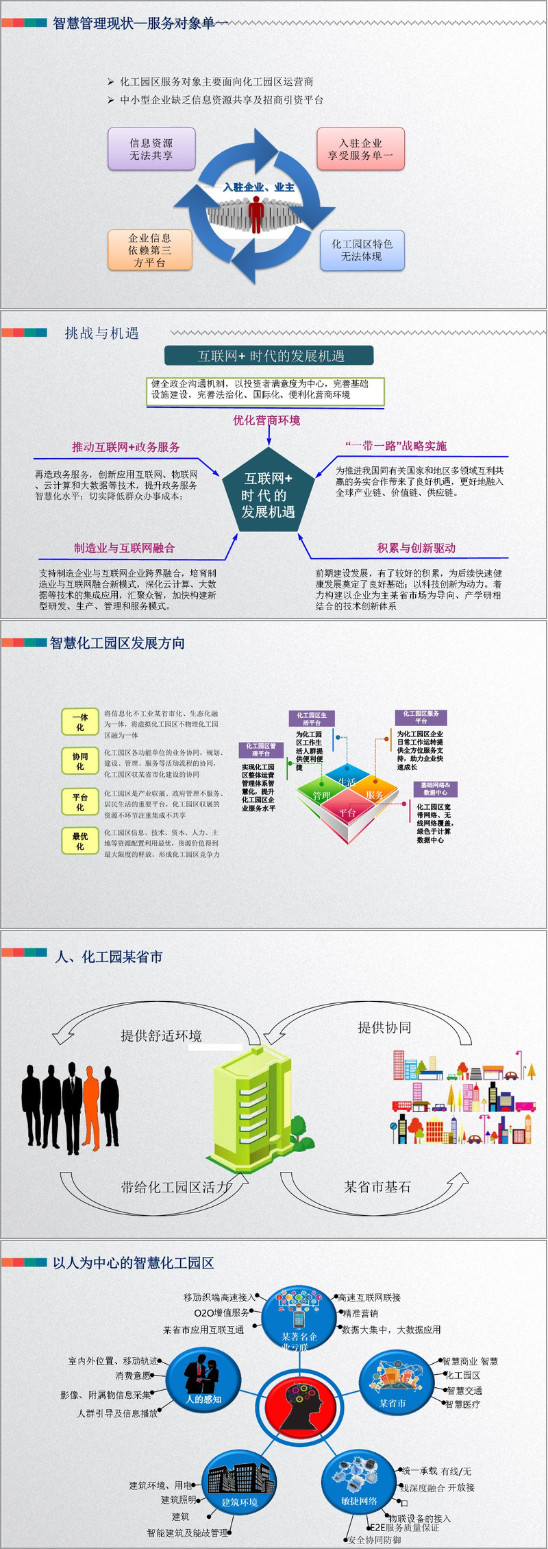 在这样的背景下,互联网 + 时代为智慧化工园区发展带来机遇。“一带一路” 战略推动国际合作,优化营商环境、推动互联网 + 政务服务、促进制造业与互联网融合等政策,为化工园区转型提供了方向。智慧化工园区的发展需围绕平台、管理、服务、生活四大维度,实现一体化、协同化、平台化、最优化,以人和入驻企业为中心,打造舒适、协同、有活力的园区环境,借助敏捷网络、智能建筑等技术,满足运营者、入驻企业、员工等不同主体的需求。