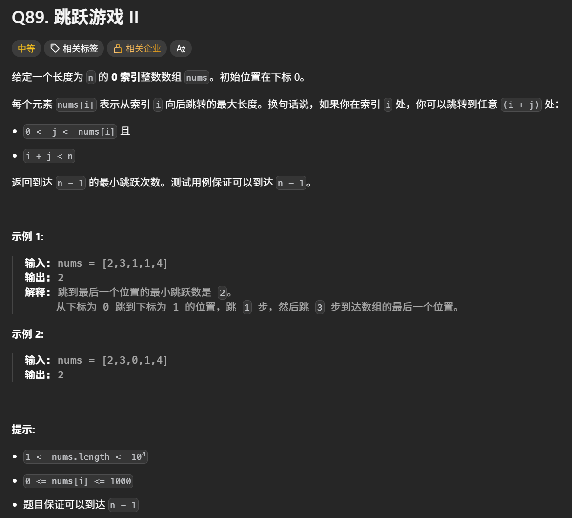 class Solution {public int jump(int[] nums) {if(nums == null || nums.length == 0 || nums.length == 1){return 0;}// 记录跳跃的次数int count = 0;// 记录当前的覆盖最大范围int curdist = 0;// 记录最大覆盖范围int maxdist = 0;for(int i = 0;i < nums.length;i++){maxdist = Math.max(maxdist,i + nums[i]);// 说明当前一步再跳一步就到达了末尾if(maxdist >= nums.length - 1){count ++;break;}//走到当前可覆盖的最大范围时,更新下一步可达到的最大范围if(i == curdist){curdist = maxdist;count ++;}}return count;}