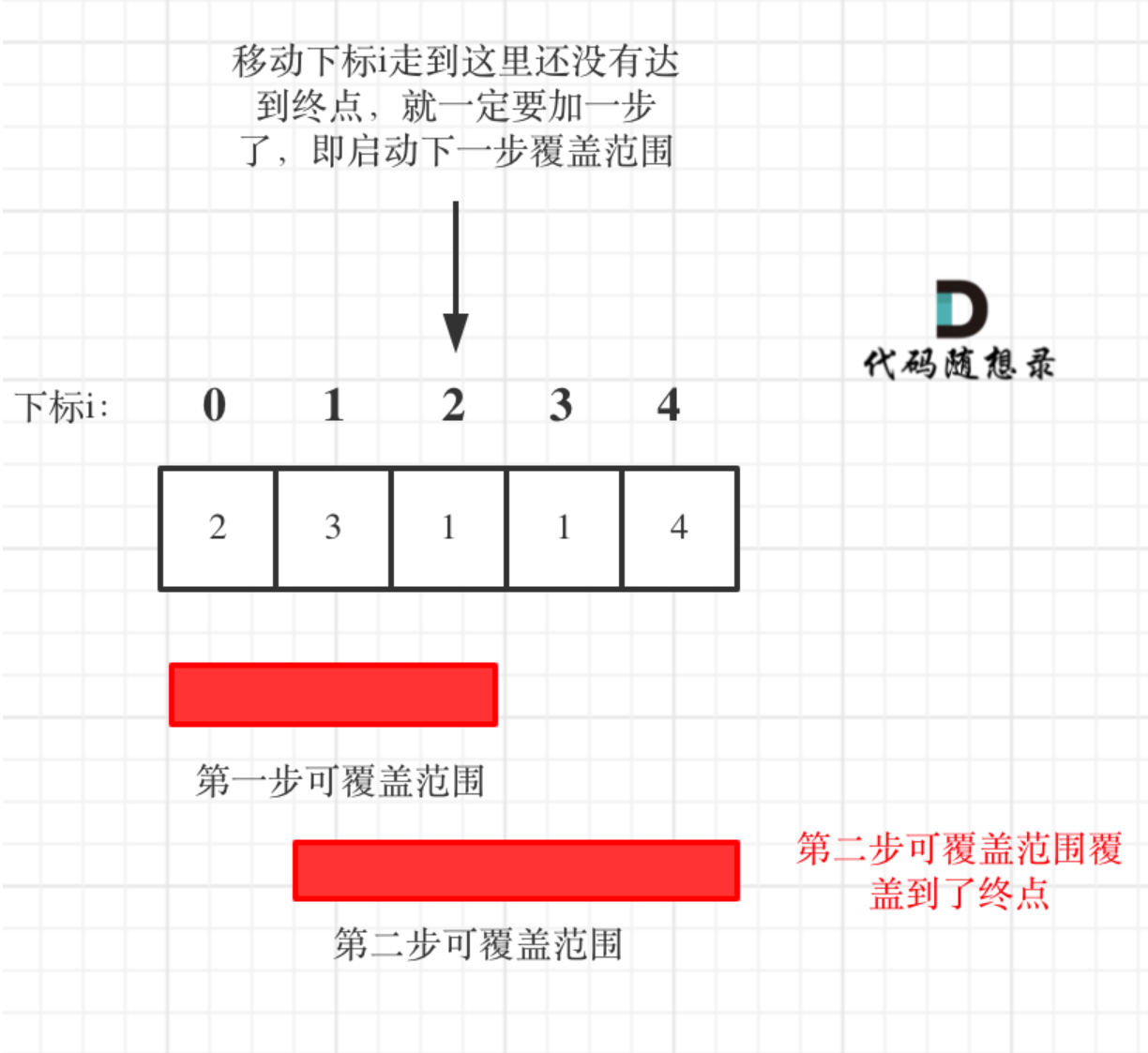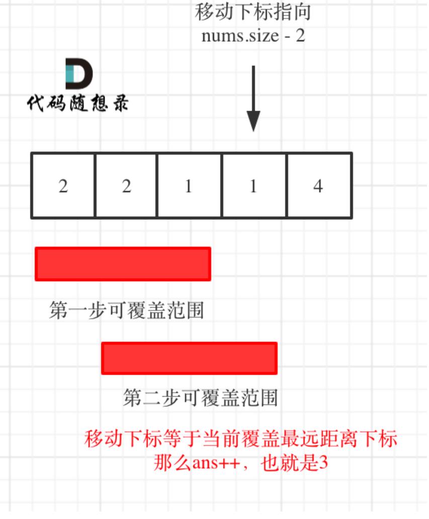 (2)注意:当移动下标达到了当前覆盖的最远距离下标时:如果当前覆盖最远距离下标就是集合终点,那么步数就不用加1了,因为不能再往后走了。