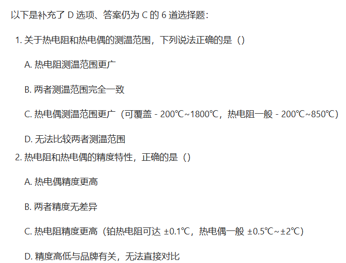 - 成本低,但线性度差、测温范围窄(通常 - 50℃~300℃)。
