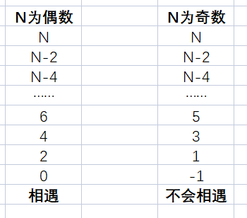 2. 如果 N 是奇数 ,第⼀轮追不上,快追上,错过了,距离变成-1,即C-1,进⼊新的⼀轮追击