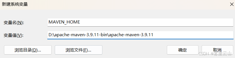 变量名为MAVEN_HOME,路径为上面复制的文件路径,然后点击确认