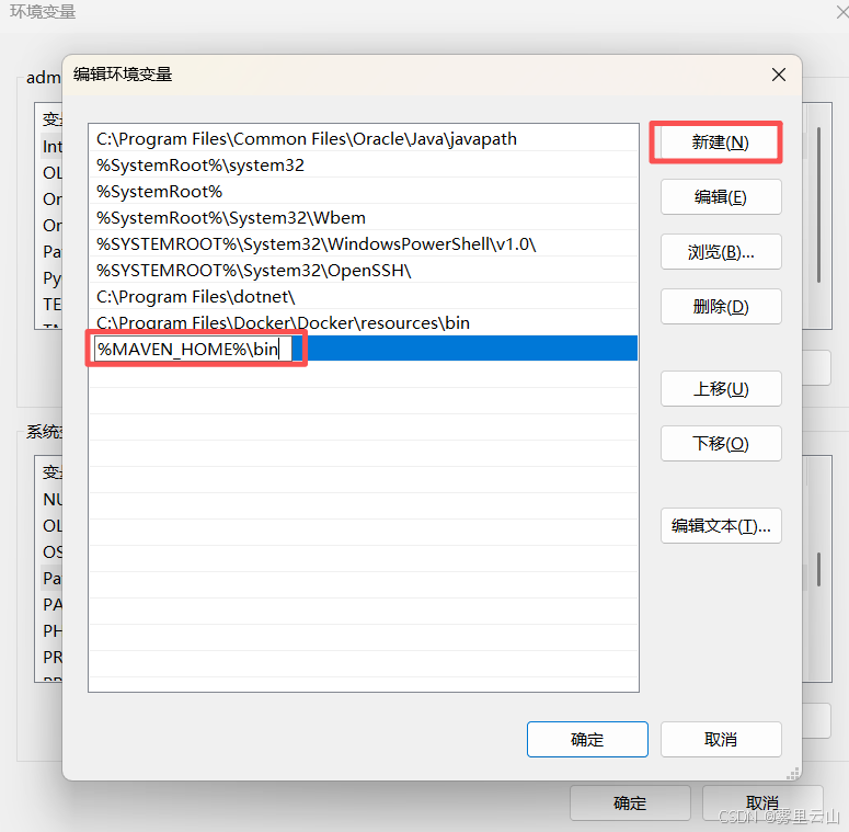 点击新建,输入%MAVEN_HOME%\bin,然后一直点确定即可