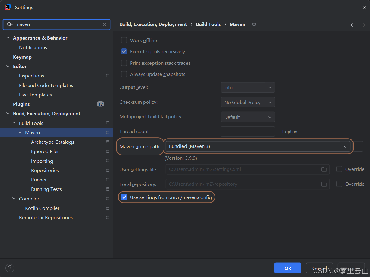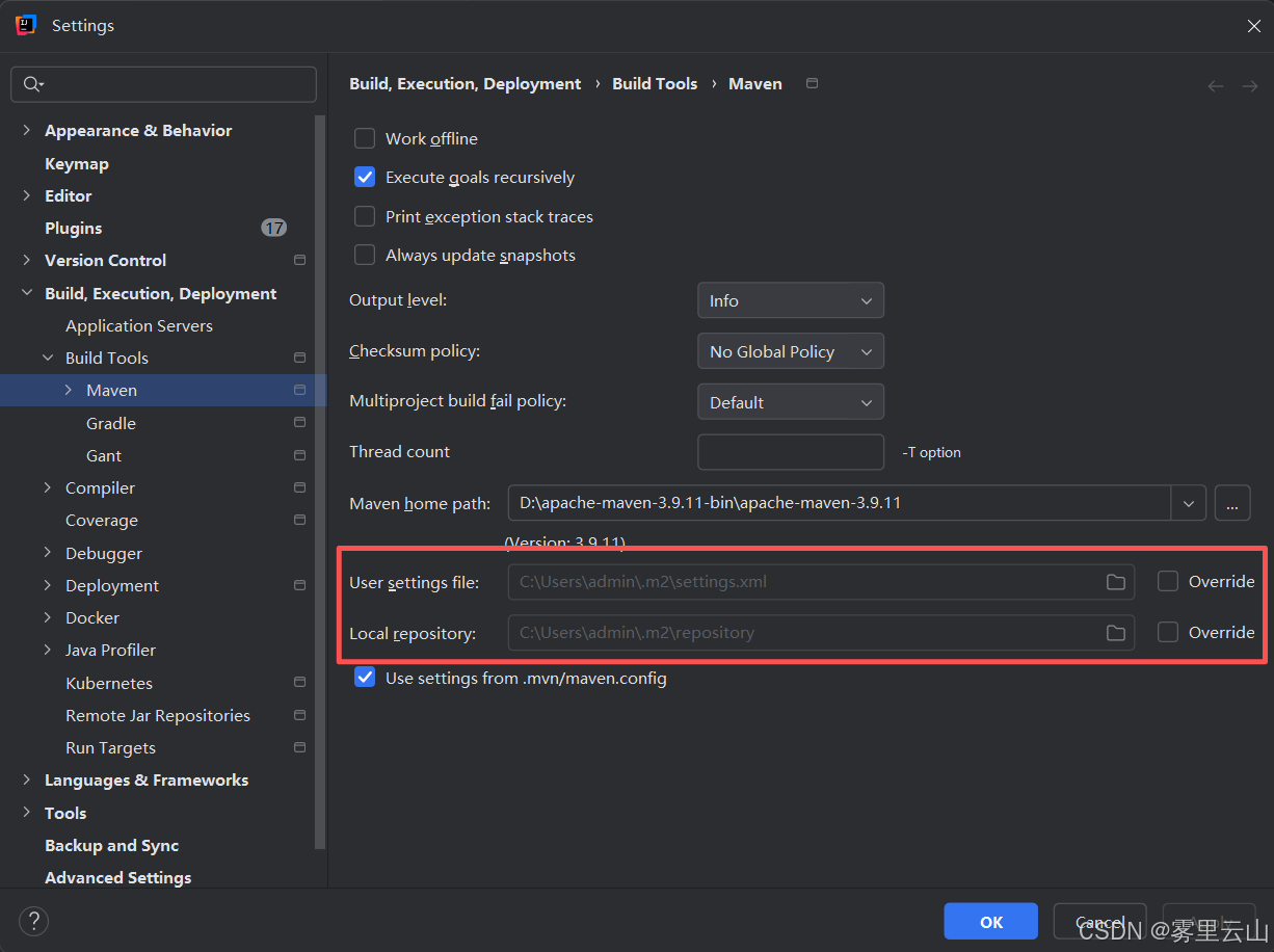 下面的这两个地方勾选Override可以使用本地的maven仓库,适用于部分依赖文件过大,或网速不稳定,无法完整下载依赖的情况,视情况使用即可。