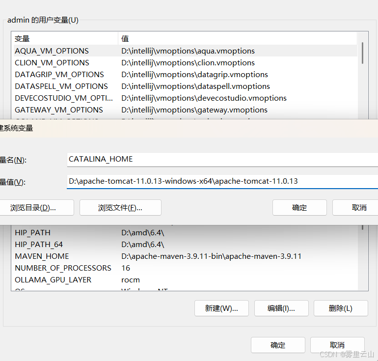 打开环境变量,新建,变量名为:CATALINA_HOME,值为路径