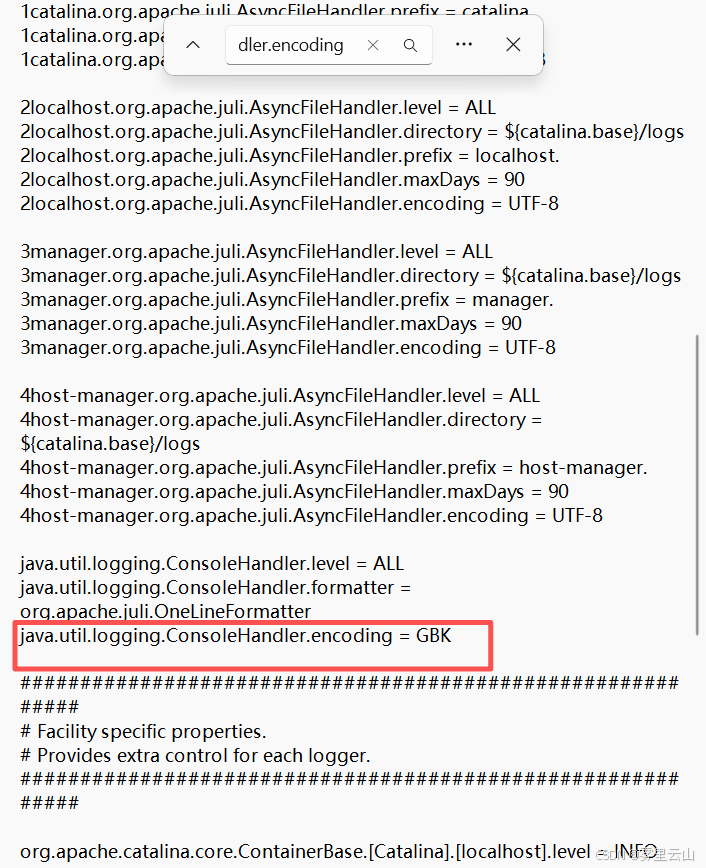 如果要解决tomcat日志乱码的问题,需要到conf文件夹下修改logging.properties中的java.util.logging.ConsoleHandler.encoding= GBK