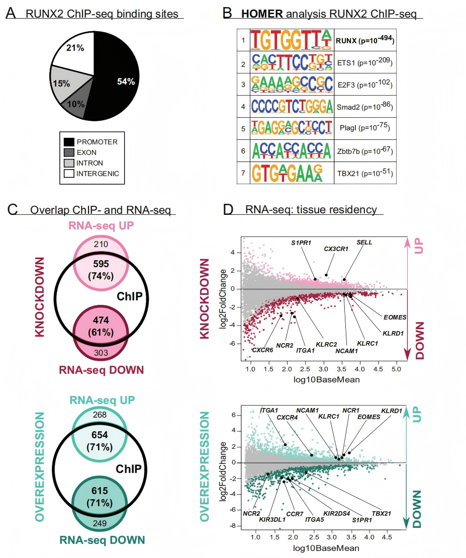 作者发现RUNX2可以促进人类成熟NK细胞的产生,其可以通过调控IL-2Rβ表达水平来控制NK细胞的发育过程。通过对RUNX2 ChIP-seq和RNA-seq数据分析发现大多数差异表达的基因都是RUNX2的直接靶标,进一步探究了RUNX2介导NK细胞分化的分子机制,说明了RUNX2调控NK细胞分化过程的重要性。