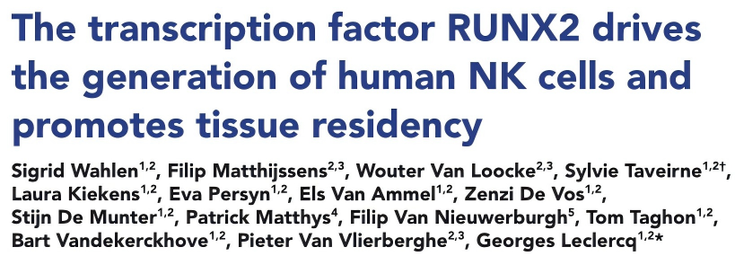 Wahlen S, Matthijssens F, Van Loocke W, et al. The transcription factor RUNX2 drives the generation of human NK cells and promotes tissue residency[J]. Elife, 2022, 11: e80320.