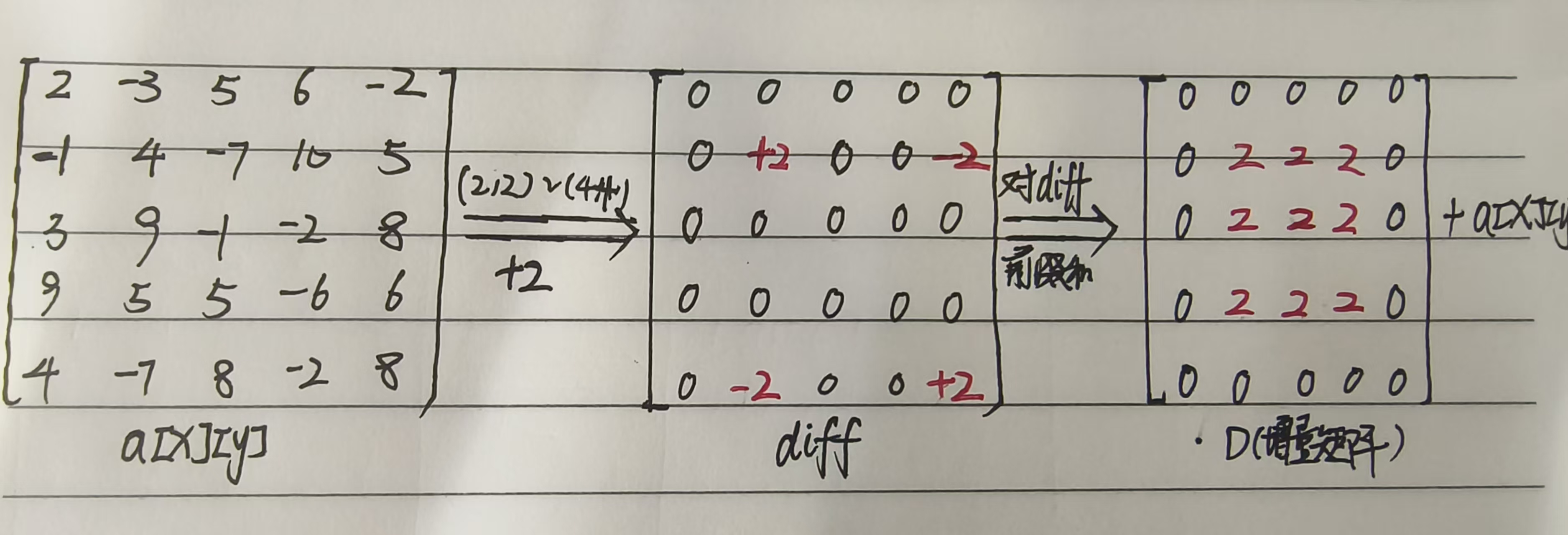 最后还原时再对差分矩阵做二维前缀和D[i][j]=diff[i][j]+a[i−1][j]+a[i][j−1]−a[i−1][j−1]得到增量矩阵D,将增量矩阵D与原矩阵相加,就顺利实现了区间的变化操作。这就是二维差分的思路核心。如果朋友们没理解,没关系,可以参考下面示例的变化过程: