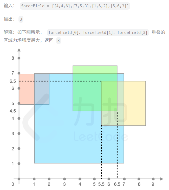 从特征上来看,这道题目的思路还是非常明确的,就是在区间上叠加变化,很明显可能会采用差分的方法不断更新原数组进行叠加。但是有一些比较值得我们注意和探讨的特殊情况。首先是上面题设中就给出来的一种情况,假设最小划分单位不是整数,而是x.5这样的小数怎么办?我们可以将所有坐标×2,这样坐标之间的相对位置不变,可以使用左移运算<<来实现(常用技巧,位运算运行时间比乘法更快);其次我们考虑一种极其特殊的情况,假设力场的范围延伸得特别远,比如说几万的量级,难道我们的差分矩阵就要开到几万的数值吗?显然这样的空间开销是难以接受的。实际上每个力场的场强只会在交界区域发生变化,同一个力场中的场强是相同且连续的。实际上,我们最终求的是最大的力场强度,而不是最大力场强度的精确位置。这样我们便引出一种技巧--离散化!