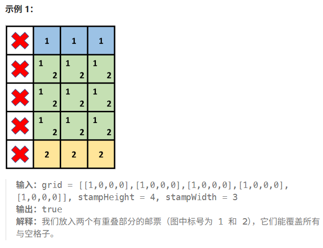 public:void build(vector<vector<int>>&m){for(int i=1;i<m.size();i++){for(int j=1;j<m[0].size();j++){m[i][j]+=m[i-1][j]+m[i][j-1]-m[i-1][j-1];}}}void add(vector<vector<int>>& diff,int a,int b,int c,int d){diff[a][b]+=1;diff[c+1][d+1]+=1;diff[c+1][b]-=1;diff[a][d+1]-=1;}int sumRegion(vector<vector<int>>& sum,int a,int b,int c,int d){return sum[c][d]-sum[c][b-1]-sum[a-1][d]+sum[a-1][b-1];}bool possibleToStamp(vector<vector<int>>& grid, int stampHeight, int stampWidth) {int n=grid.size();int m=grid[0].size();//前缀和数组,查询原始矩阵中某个范围的累加和很快vector<vector<int>> sum(n+1,vector<int>(m+1));for(int i=0;i<n;i++){for(int j=0;j<m;j++){sum[i+1][j+1]=grid[i][j];}}build(sum);//差分数组//当贴邮票的时候,不在原始矩阵里贴,在差分矩阵里贴//原始矩阵里只用来判断能不能贴邮票,不进行修改//每帖一张邮票都在差分矩阵里修改vector<vector<int>> diff(n+2,vector<int>(m+2));for(int a=1,c=a+stampHeight-1;c<=n;a++,c++){for(int b=1,d=b+stampWidth-1;d<=m;b++,d++){//原始矩阵中(a,b)左上角点//根据邮票规格算出右下角点(c,d)//这个区域彻底都是0,那么这个区域可以贴邮票if(sumRegion(sum,a,b,c,d)==0){add(diff,a,b,c,d);}}}build(diff);for(int i=0;i<n;i++){for(int j=0;j<m;j++){if(grid[i][j]==0&&diff[i+1][j+1]==0){return false;}}}return true;}