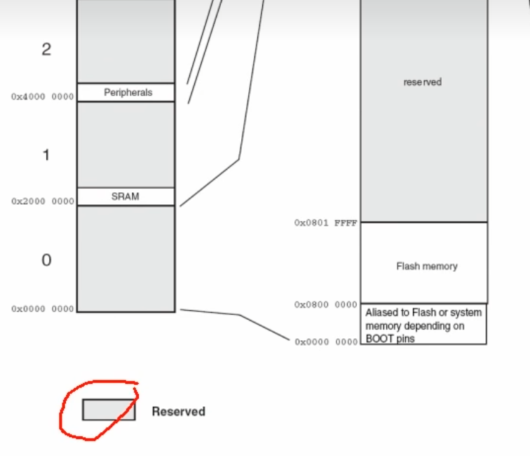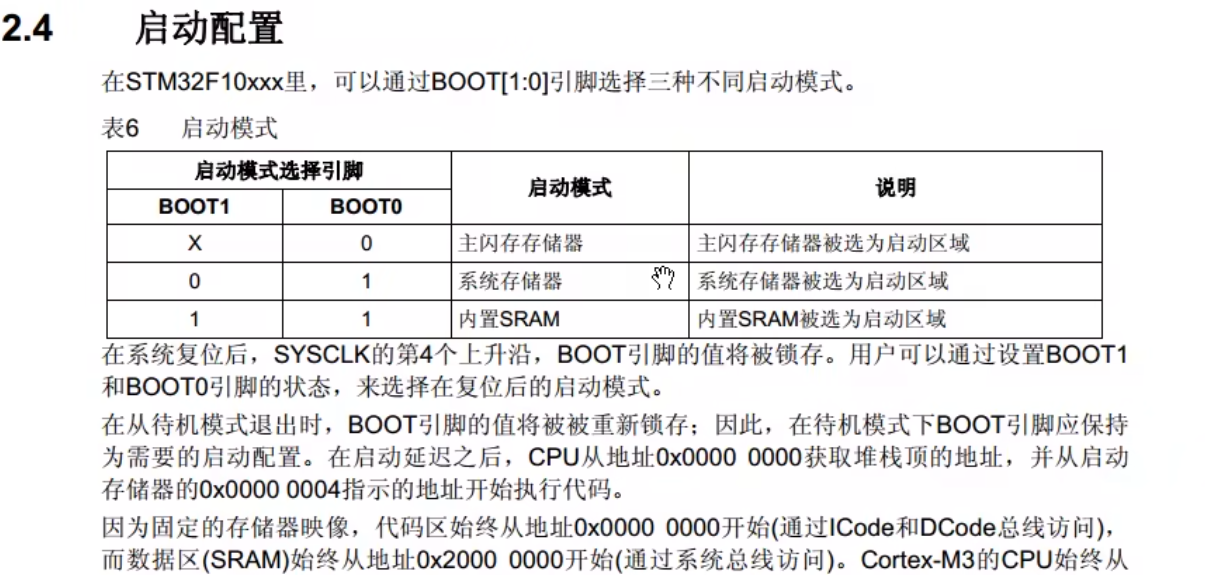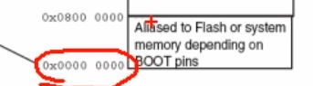 然后这个0地址实际上也是没有存储器的。这里写的是别名到Flish或者系统存储器,取决于Boot引脚。因为程序是从0地址开始运行的。所以这里把我们想要执行的程序,映射到0地址来。如果映射到Flish区,那么就从Flish开始执行程序。如果映射到系统存储器区,那么就是从系统存储器区,运行BottLoader。如果映射到SRAM就是从SRAM启动。