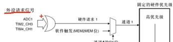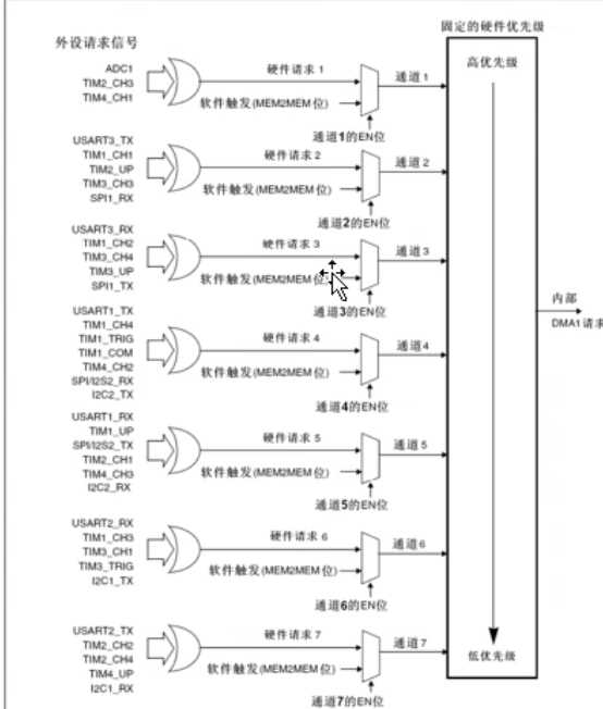 之后这七个通道进入仲裁器进行优先级判断,最终产生内部的DMA请求。类似于中断的优先级,默认通道号越小,优先级越高。也可以再程序中,配置优先级。