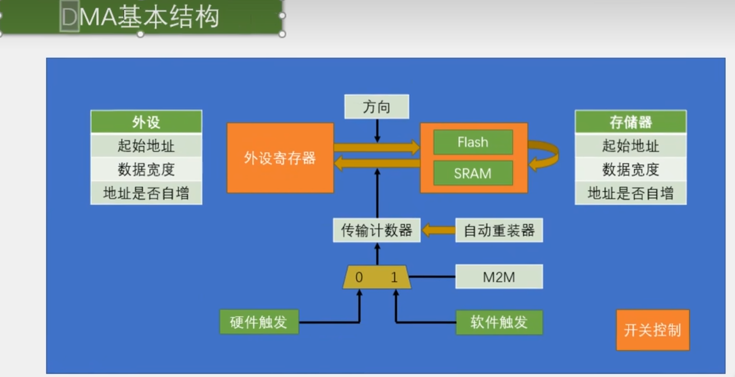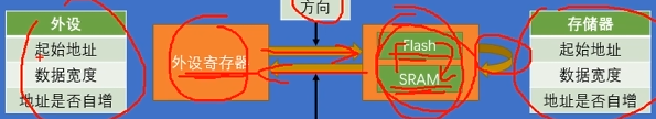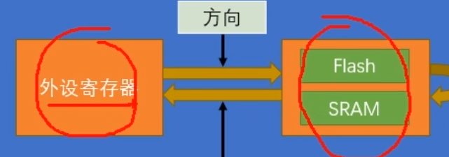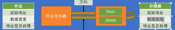 如果要进行存储器到存储器的数据转运,那我们就需要把其中一个存储器的地址,放在外设的站点,这样就可以了,只要你在外设地址里写Flash或SRAM的地址,那么DMA就会到Flash或者SRAM里面去找数据。