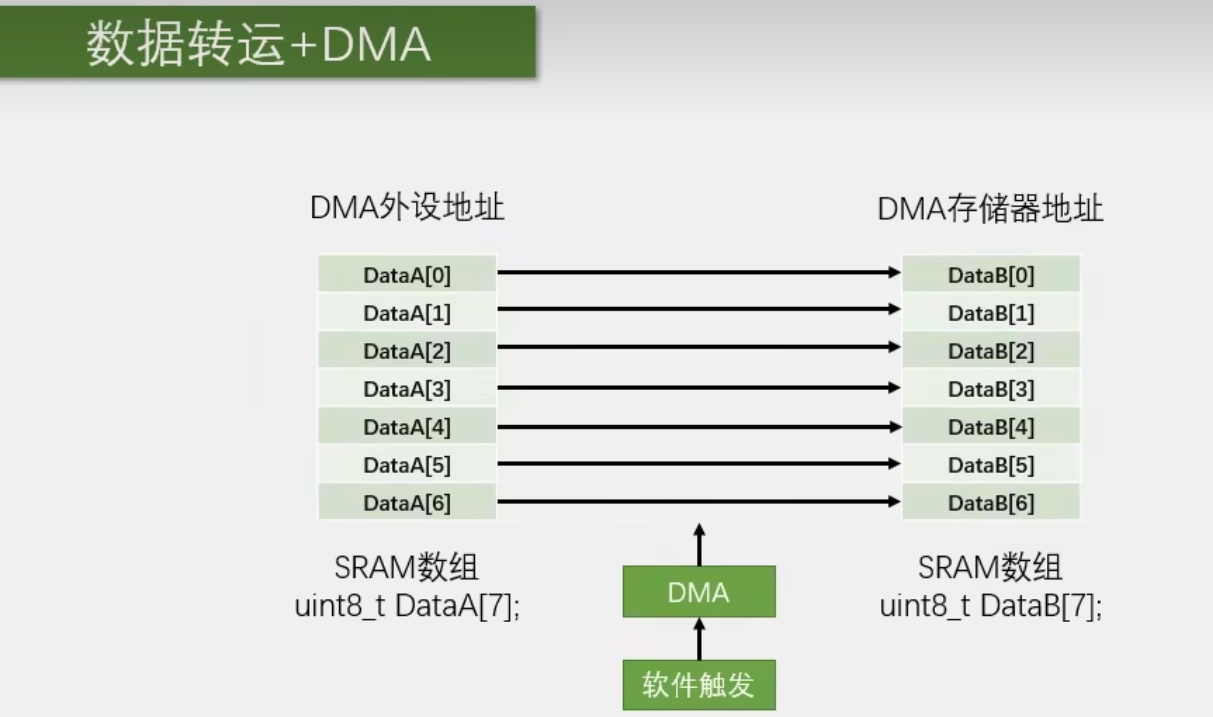 在外设和存储器,存储器和存储器之间转运数据,就可以用DMA来完成,并且在转运的过程中,无需CPU参与。节省了CPU资源,CPU省下来了时间,就可以干一些其他的,更加专业的事情。搬运数据这种杂活,交给DMA就可以了。