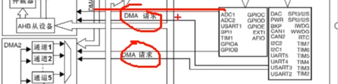 这里是DMA请求也就死触发的意思,这条线路右边的触发源,就是各个外设,所以这个DMA请求,就是DMA的硬件触发源。比如ADC转换完成,串口接收到数据。需要触发DMA转运数据的时候,就会通过这条线路,像DMA发出硬件触发信号。之后DMA就可以执行数据转运的工作了。