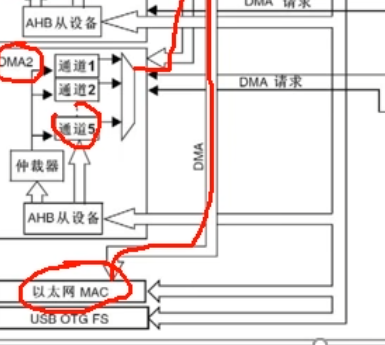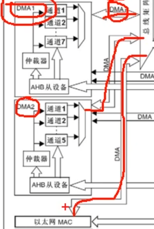 这里可以看到DMA1有一条总线,DMA2有一条,下面的以太网也有一条,这个可以先不管。