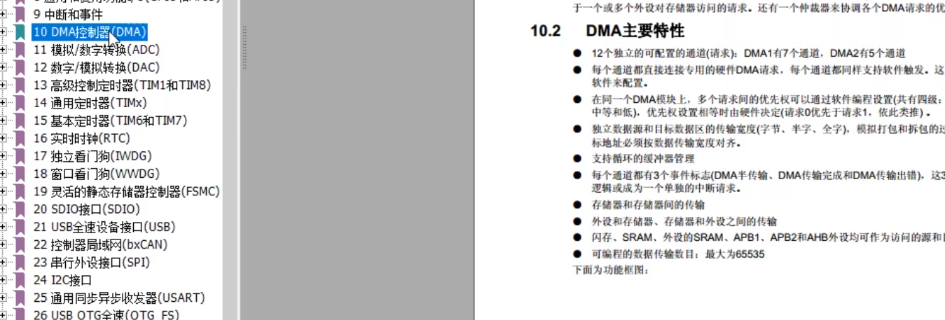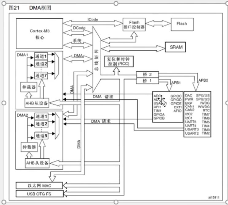 这款芯片有2个DMA控制器(DMA1、DMA2),共12个通道(DMA1有7个,DMA2有5个)